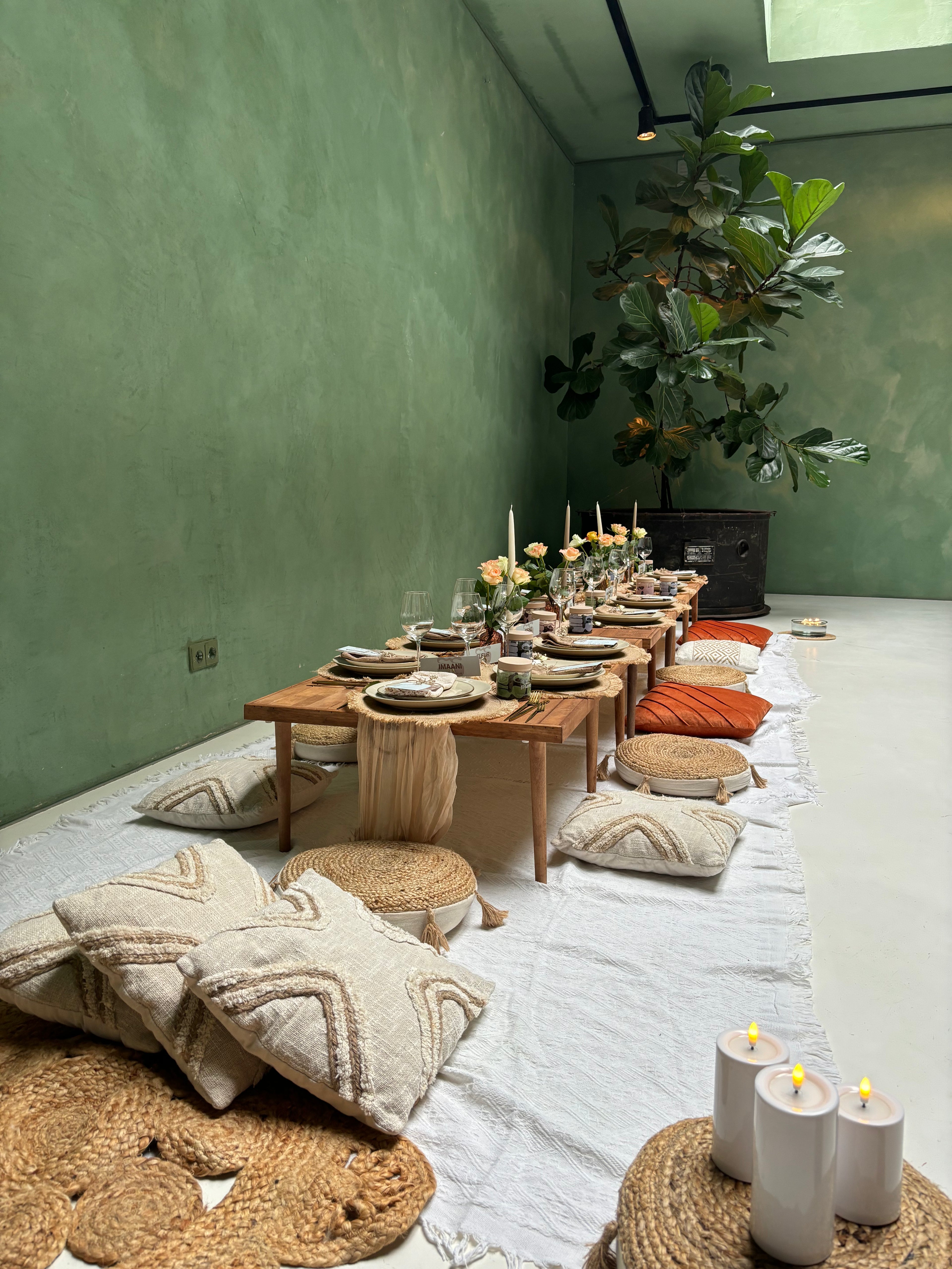 Actually pretty much everything you need for a luxury pop-up picnic: A completely decorated picnic table, included plates, cutlery, glasses/cups, etagere, table covers, table runners, placemats, napkins and serving boards. As well as pillows, luxury picnic rugs, vases with dry flowers and candleholders with candles.